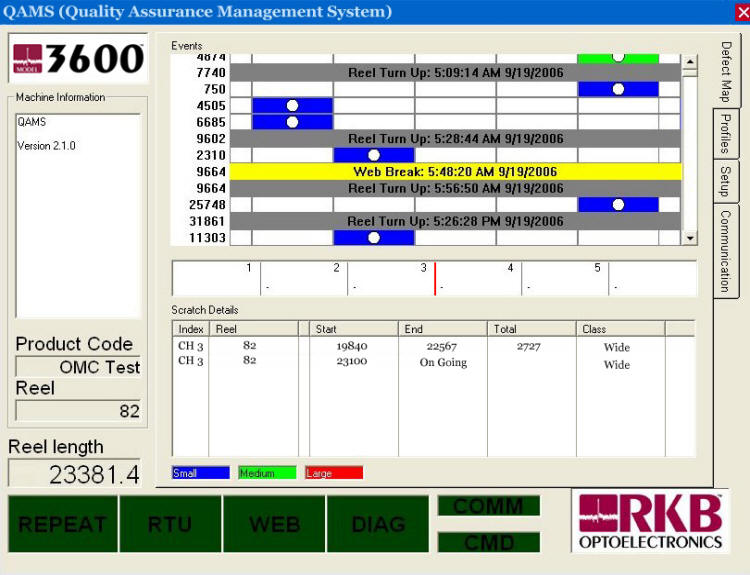 Our Windows based QAMS (Quality Assurance Management System) program provides complete data analysis and reporting capabilities of the web material you are inspecting. QAMS will provide full diagnostics of both the process machine (i.e., paper machine, coater, sheeter, etc...) and the web inspection system itself. QAMS software can be included with or without all of our main inspection technologies depending on your budget, inspection goals, needs and wants. QAMS receives data information via proprietary signal processing hardware and deciphers the data into user friendly parameters that operational, technical and managerial staff can utilize. This information can be defect type, defect size, defect location in MD and CD direction, defect quantity, product reel footage, defect start/stop times, etc. Additional intelligence such as process machine diagnostics (i.e., repeating defects analysis, defect intervals, location, and likely cause; dryer, felt, wire, etc.) and machine vision diagnostics (i.e., power supplies, sensors, lamps, blowers, etc.) as well as a variety of other significant data is received, processed and scrutinized by the QAMS.